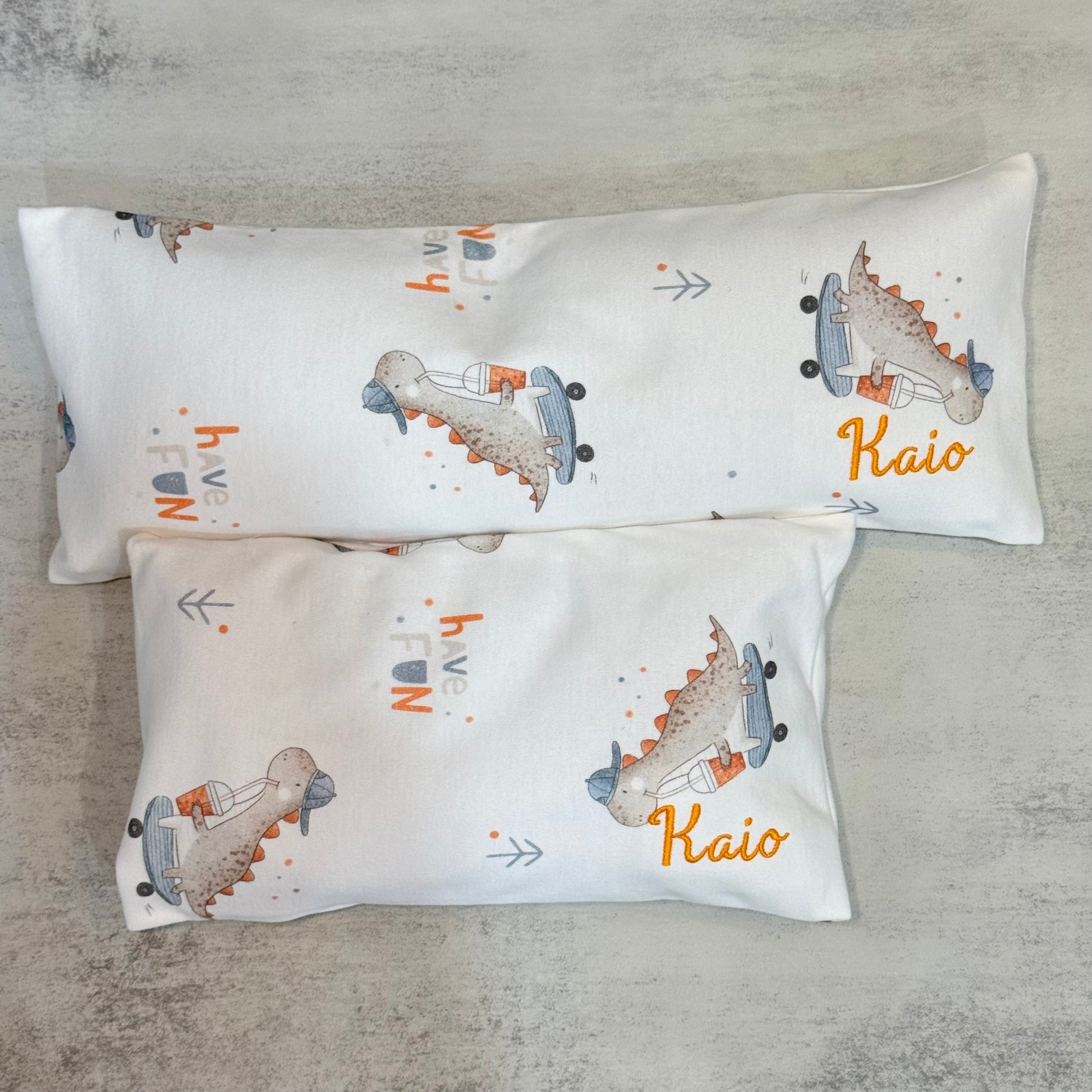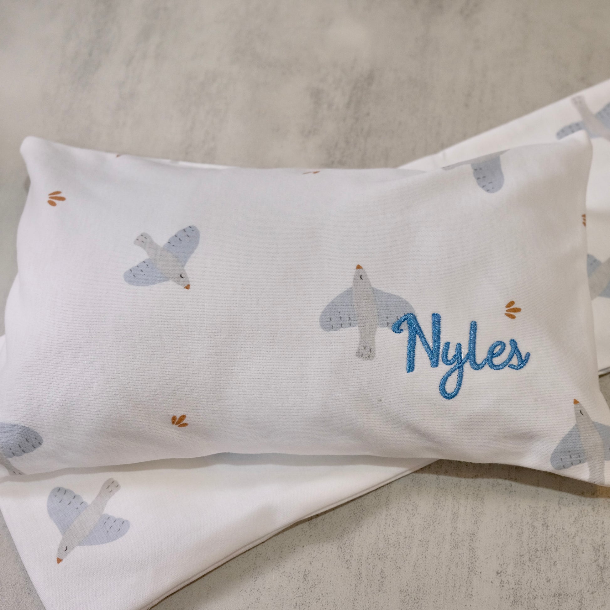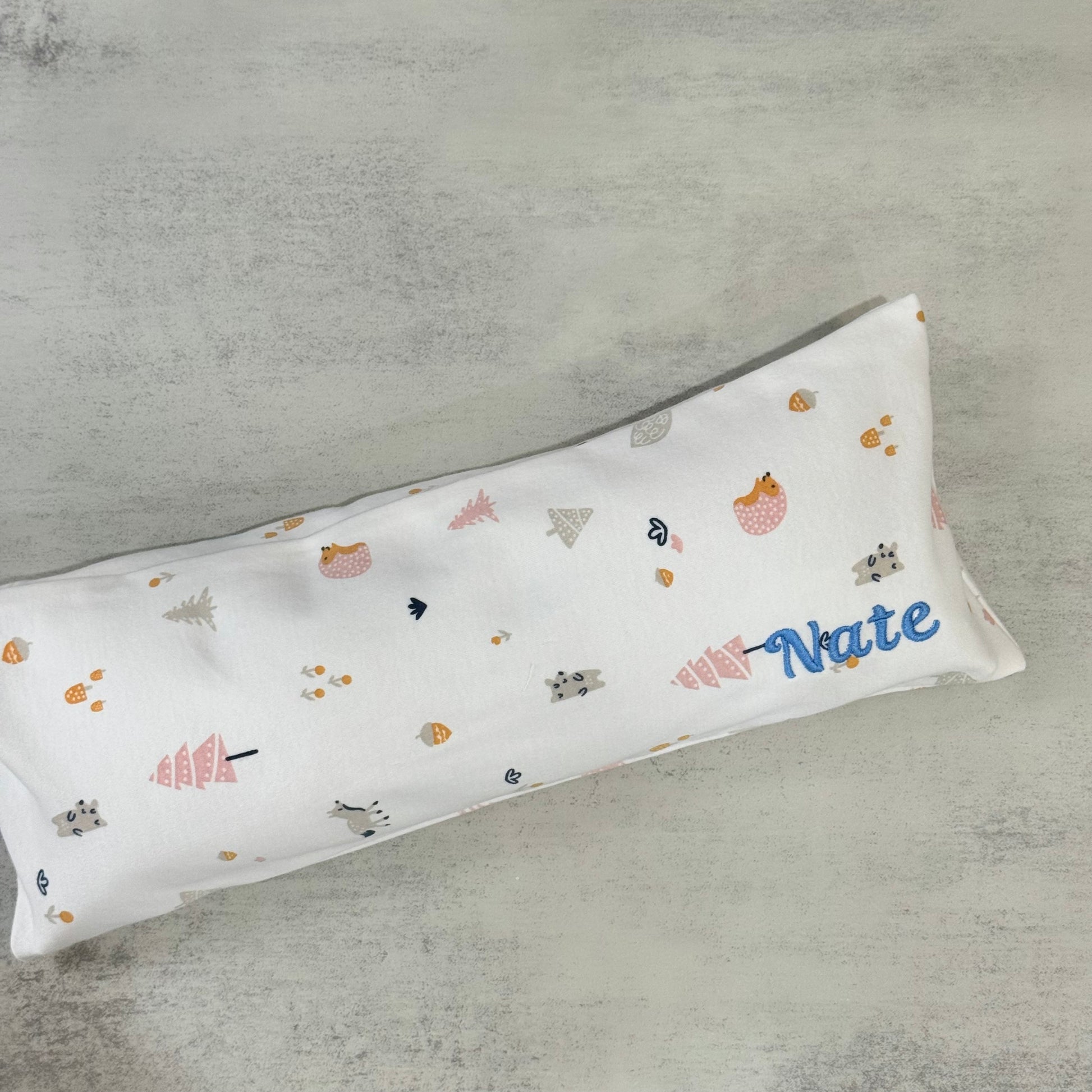 The name will be embroidered on the bottom right of the husk pillow. The height of the name embroidered will be around 2.3cm - 2.6cm.
